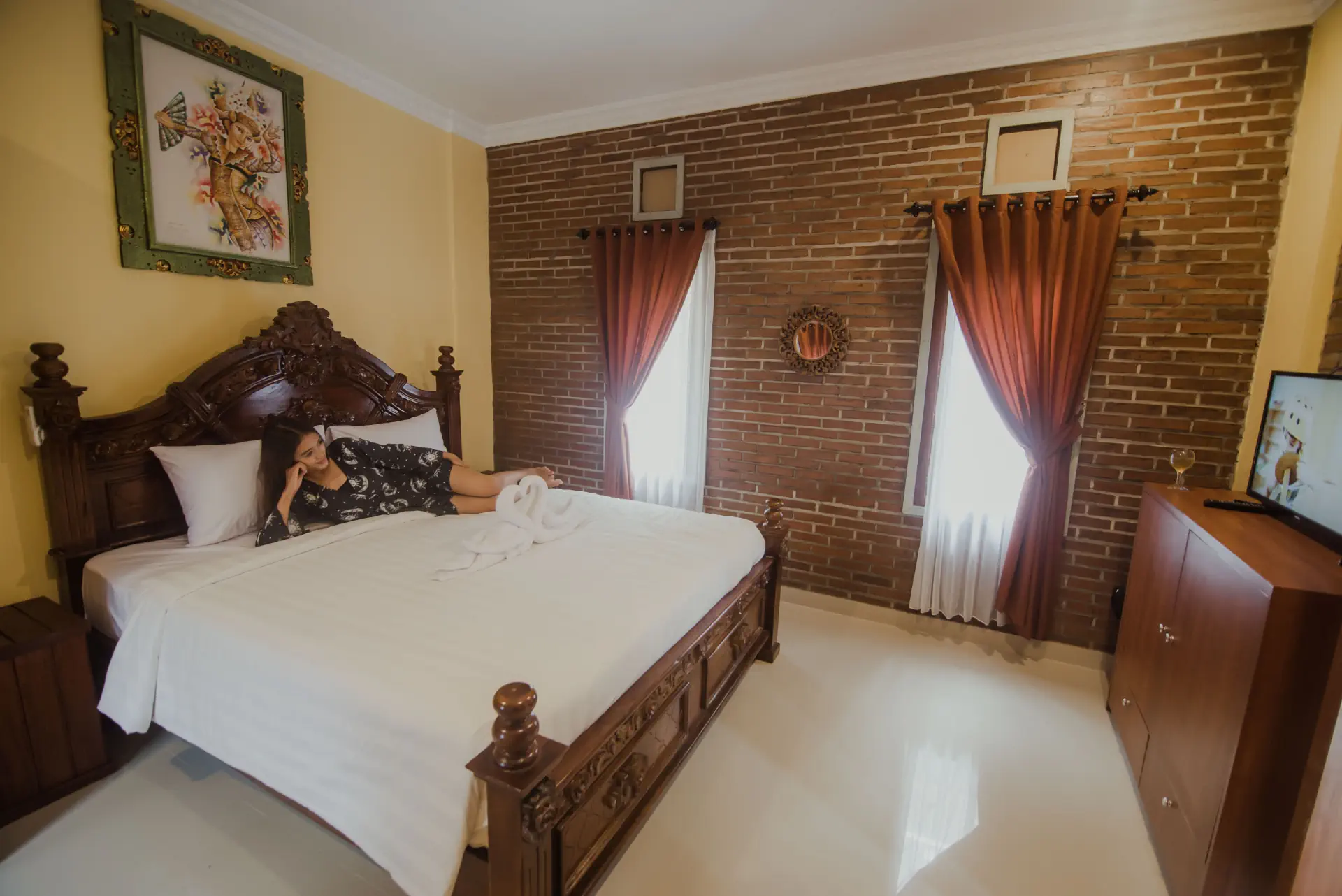 Cozy room in traditional Balinese overlooking pool with one double bed